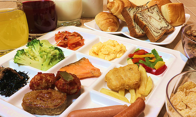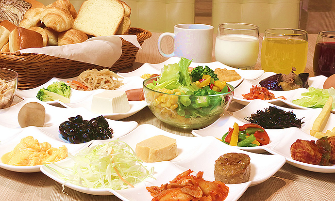 6:30~9:30まで1F朝食会場にて和洋バイキング形式の朝食をご用意いたします。コーヒー、紅茶、ジュースなどの各種ドリンクもございますので、自由にお召し上がりください。
